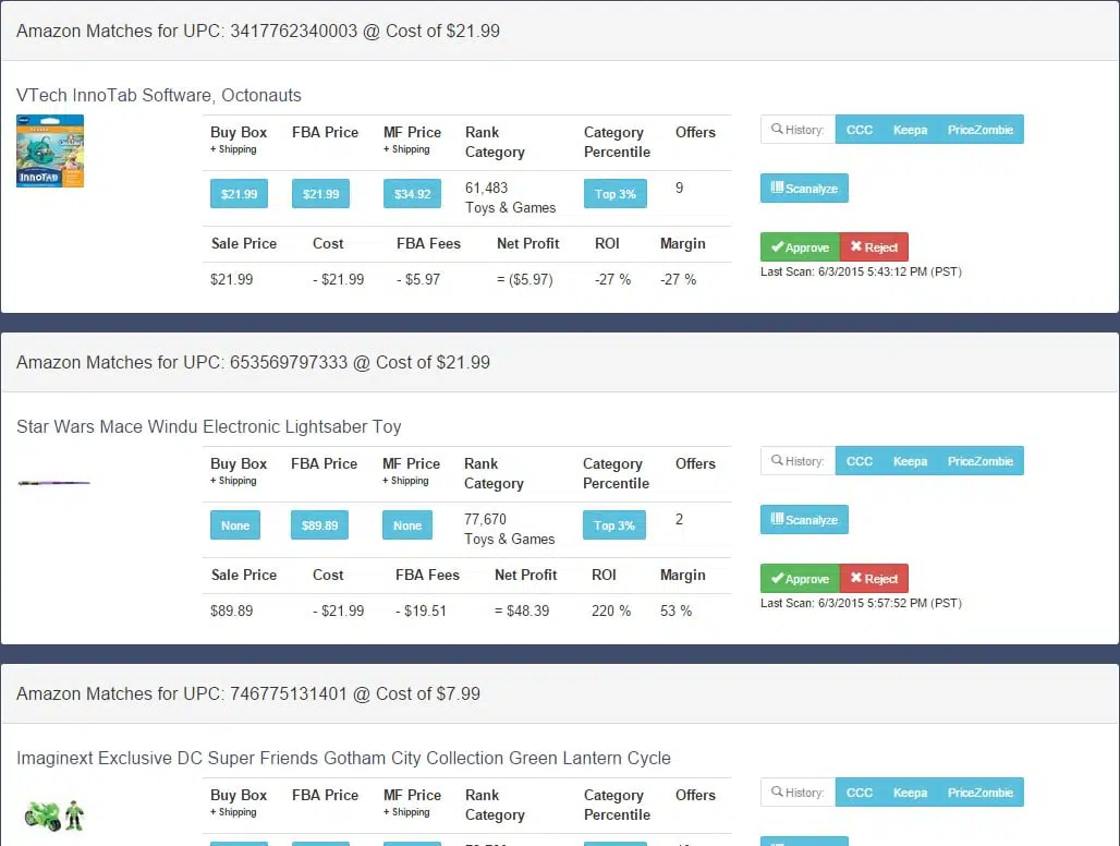 ScanSheet can analyze hundreds, even thousands, of products an hour, saving your countless hours of work. ScanSheet will match the product based on either the ASIN, UPC or title to the Amazon listing. Then, based on the cost provided in the spreadsheet, net profit, ROI and margin will automatically be calculated.